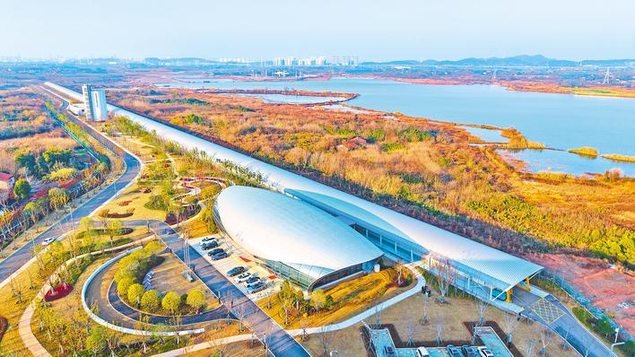 一公里长的测试线,被银色的顶棚整体覆盖,远远望去,如一条巨龙卧在牛山湖旁。(湖北日报全媒记者 魏铼 摄)