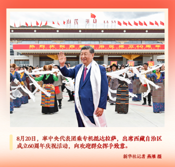 青藏高原,秋风送爽。8月20日,当习近平总书记乘坐的专机在机场降落,等候在停机坪的西藏各族各界群众热烈欢呼起来。习近平作为中共中央总书记、国家主席、中央军委主席率中央代表团到西藏出席西藏自治区成立庆祝活动,这在党和国家历史上是第一次。洁白哈达、切玛和青稞酒、欢快的民族舞蹈、红旗和五彩花束的海洋……各族群众深情表达着对总书记的热烈欢迎与真诚祝福。