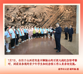 7月7日,时值全民族抗战爆发88周年,山西阳泉狮脑山巅,骤雨初歇。站在中国共产党领导军民挥洒热血、英勇战斗过的土地,习近平总书记嘱托来参观百团大战纪念馆的青少年学生:“前事不忘,后事之师。孩子们要争做民族的脊梁,一定要把我们国家建得更加强盛。”