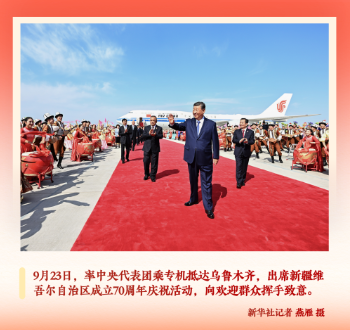 一个多月后,习近平总书记率中央代表团来到乌鲁木齐,同新疆各族人民共同庆祝盛大的节日。习近平作为中共中央总书记、国家主席、中央军委主席率中央代表团到新疆出席新疆维吾尔自治区成立庆祝活动,在党和国家历史上也是第一次。喜庆的乐曲声中人群欢腾,打起手鼓、高举礼盒、挥舞哈达、手捧盖碗茶、弹起库姆孜……绚丽多彩的大地,朴实热情的人民。