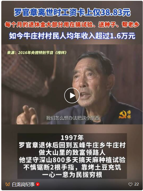 有人说,如果罗官章卖技术、卖种子,早就成为千万富翁了。可他不仅免费教技术,还自掏腰包帮助困难群众。家人在整理他的遗物时,没见到一栋房、一辆车、一样贵重物品,银行卡里的余额最后定格在38.83元。