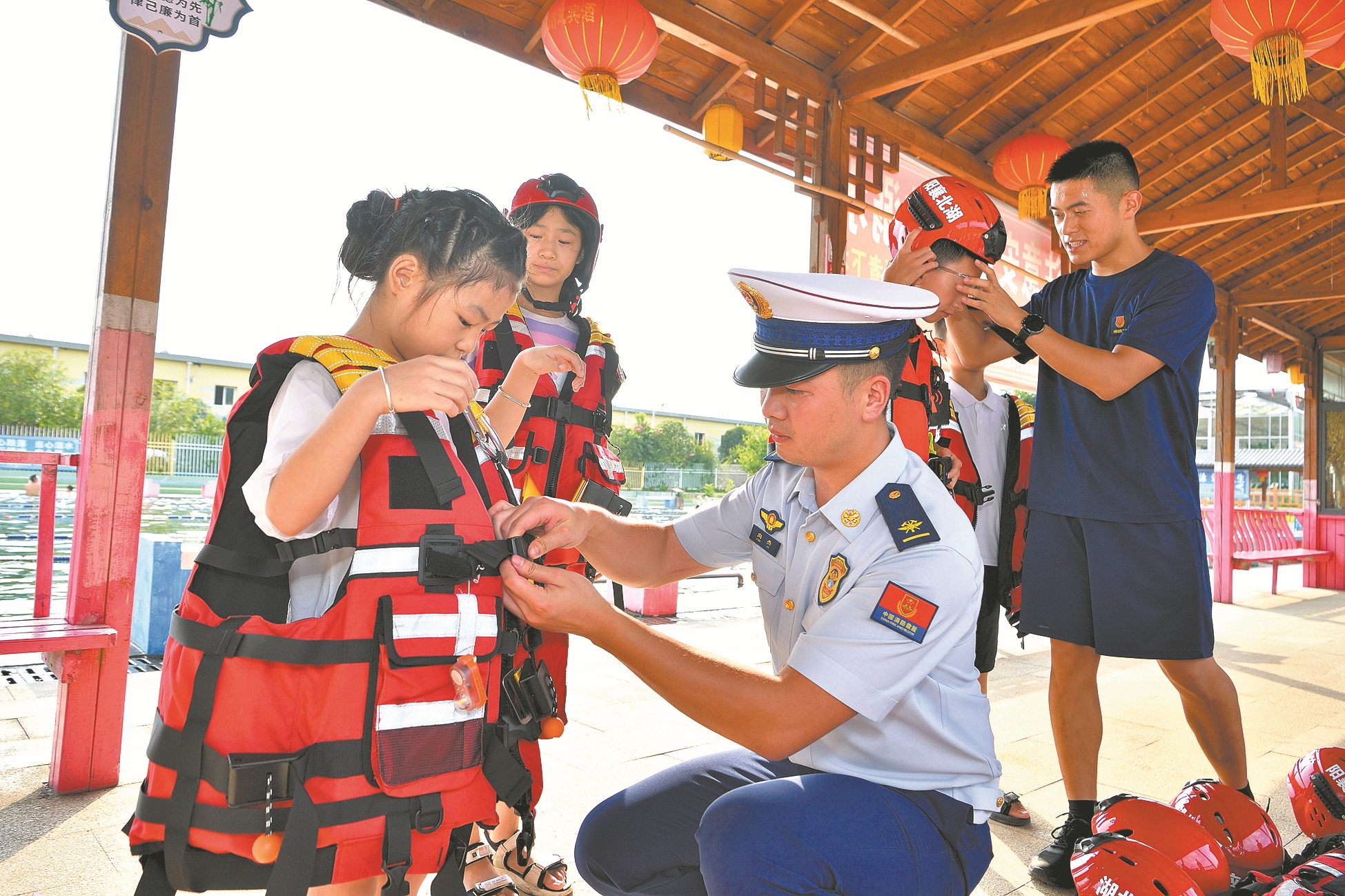 8月5日,在保康县马良镇陈家湾村,消防员帮助学生穿救生衣。