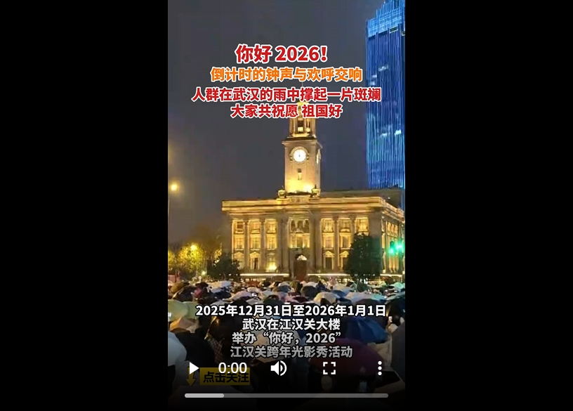 2025年12月31日晚11:45,江汉关广场,“你好,2026”江汉关跨年光影秀活动正式启幕,《长江之歌》拉开跨年盛宴的帷幕,用悠扬乐声为全国观众送上辞旧迎新的祝福。这是武汉爱乐乐团专门为跨年夜录制的展播乐曲,也是百年钟楼第一次以交响乐为跨年夜开场。