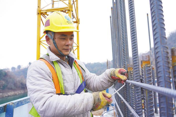 今年40岁的张海兵有十余年钢筋绑扎经验,细如发丝的扎丝在他手指间翻飞。“桥梁工程犹如人体,混凝土是‘肌肉’,钢筋就是‘筋骨’。”张海兵说,绑扎钢筋看起来很简单,实则藏着大学问,松了容易导致钢筋移位,太紧了又会损伤扎丝。