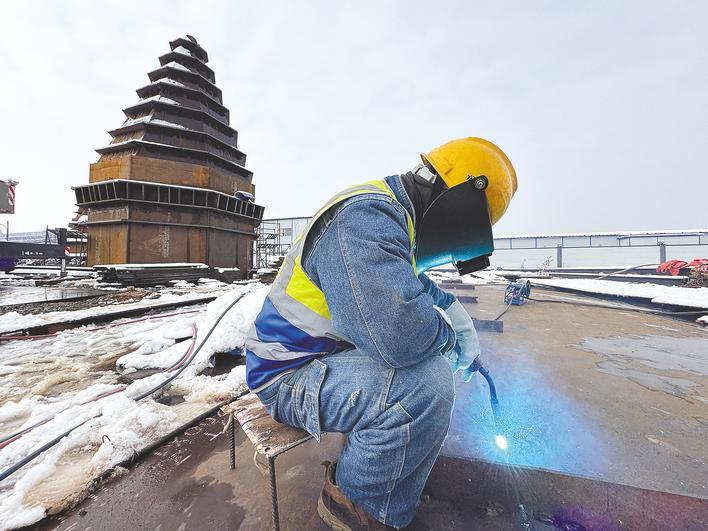 “每根大梁都得精调到毫米级,基础稳了后续施工才不会跑偏。”蹇腾飞拉下口罩,抹了把冻红的鼻尖,准备转战下一根钢梁。
