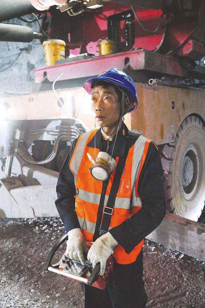 一台双滑臂电脑凿岩台车旁,36岁的李武贵双手紧握着遥控器,眼睛盯着屏幕上的跳动参数,随着指尖轻轻推移遥感手柄,钻杆缓缓向山体内钻去,细碎的岩屑混着冷却水,顺着岩壁流下。