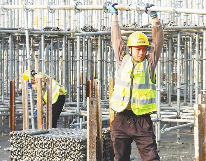 仅仅一天,8米多高的首层支模架已经立起,纵、横向的盘扣架交织成一个巨大的立体网格。“力气活一出汗,外套反而成累赘。”天寒地冻,有的工人甚至只穿了件短袖。