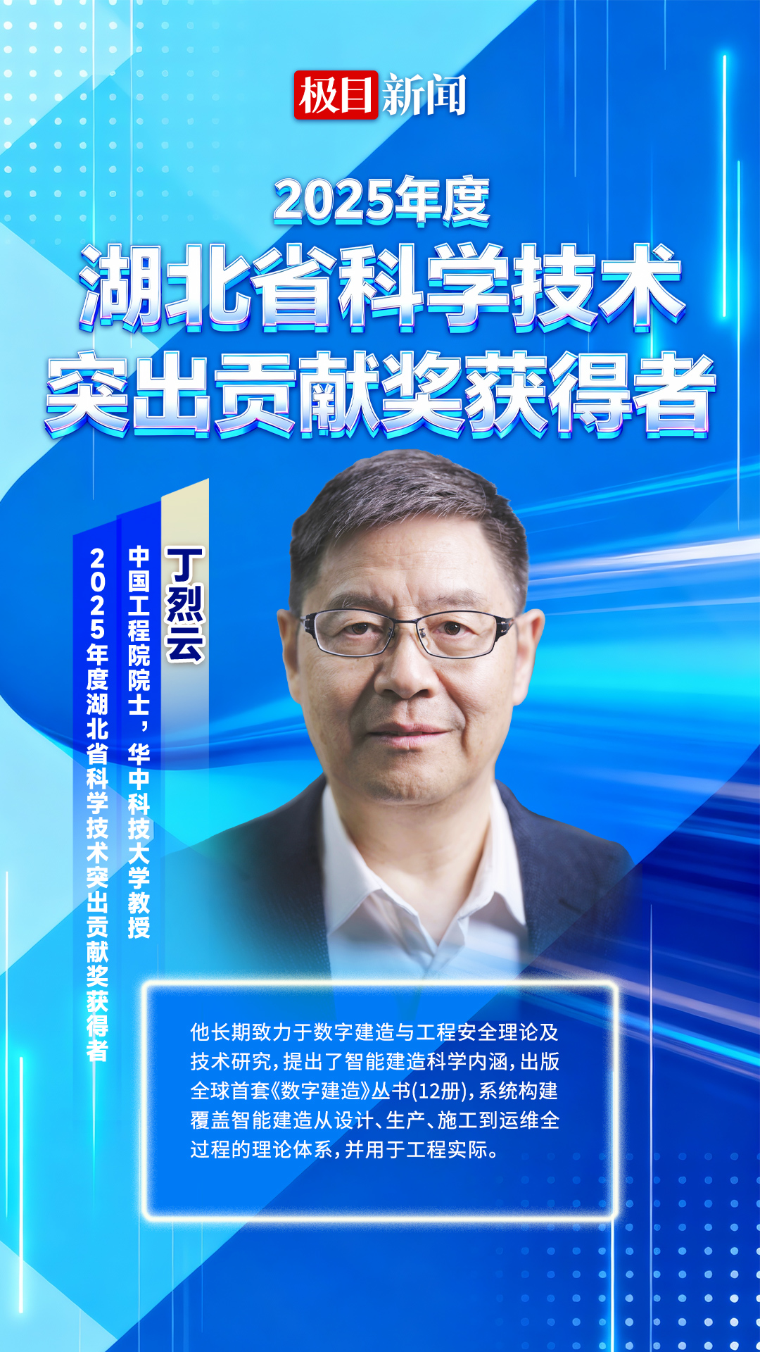 2025年度湖北省科学技术突出贡献奖授予了这位70岁的科学家。他长期致力于数字建造与工程安全理论及技术研究,提出了智能建造科学内涵,出版全球首套《数字建造》丛书(12册),系统构建覆盖智能建造从设计、生产、施工到运维全过程的理论体系,并用于工程实际,为湖北乃至全国的智能建造科技进步提供了重要支撑。
