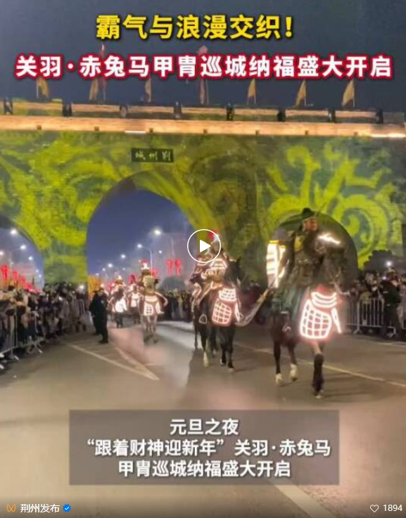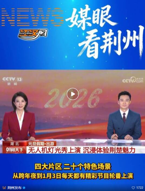 元旦期间,荆州以“穿越十二时辰 玩转千年荆州”为引,在全市范围内铺开了近110场文旅盛宴。无人机大秀、古城夜游、非遗火舞、楚风竞技、实景演艺、新春灯会……传统与科技、静谧与喧腾、厚重的历史与轻快的体验,在这里奇妙共生。