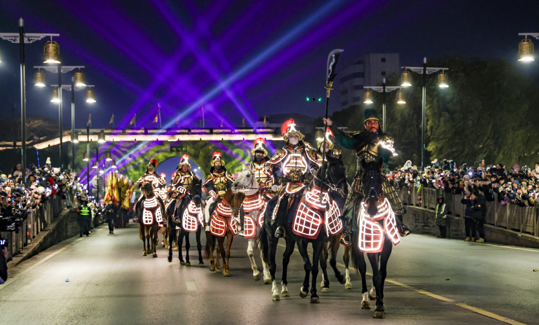 在古城东门,由2026架无人机组成的“万马奔腾”主题大秀,将新春的祝福与科技美学写满夜空。金甲“关羽”率队策马巡城,威严的仪式感与夜空中的光影奇观,共同完成了现代科技与历史图腾的跨时空对话。