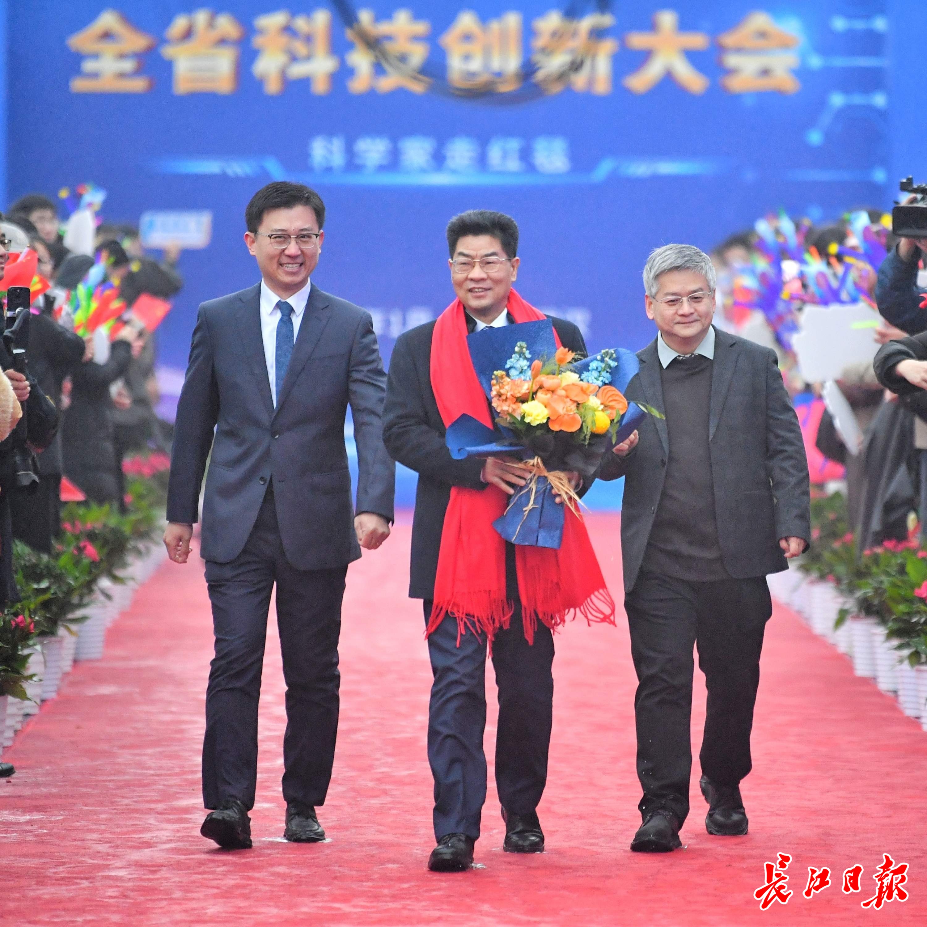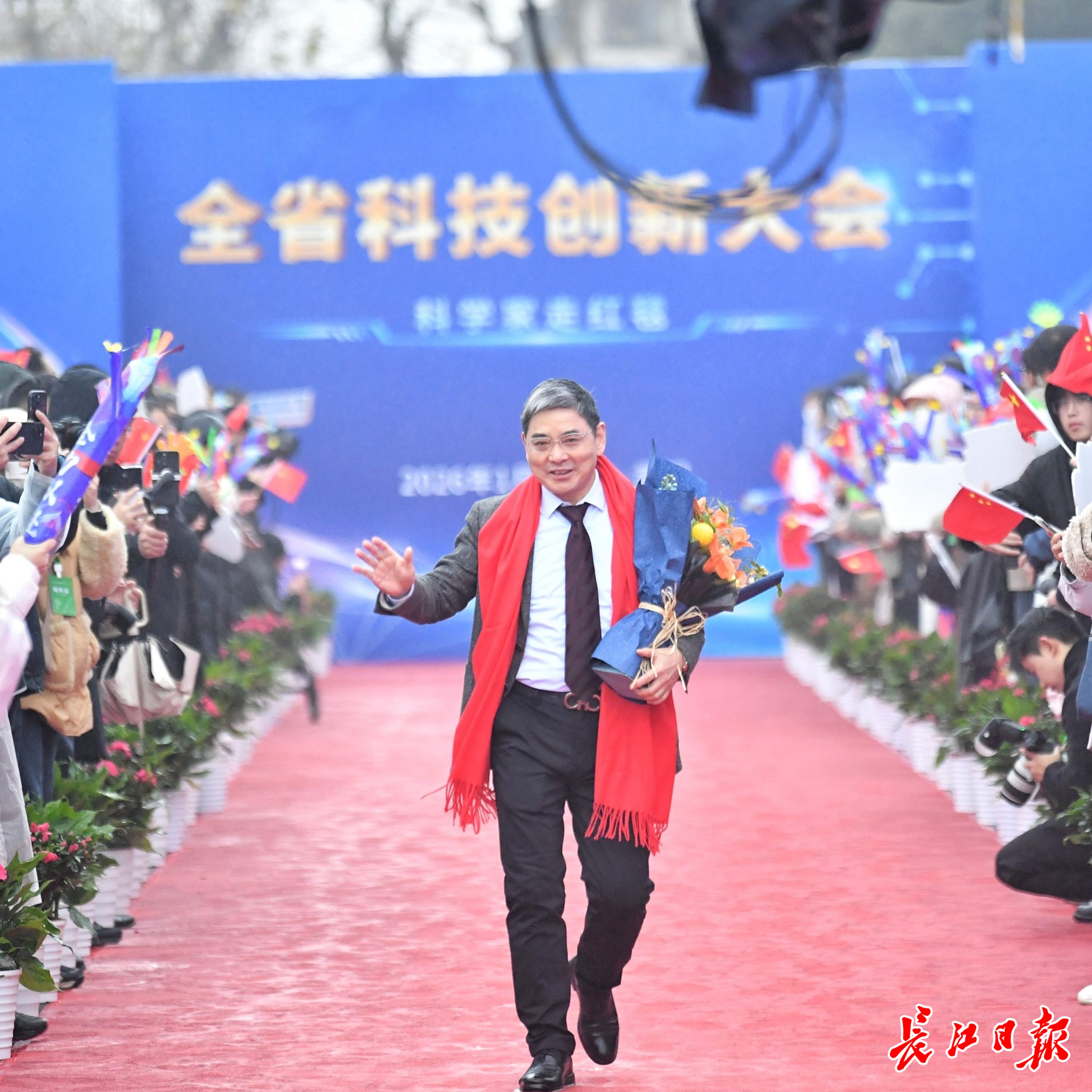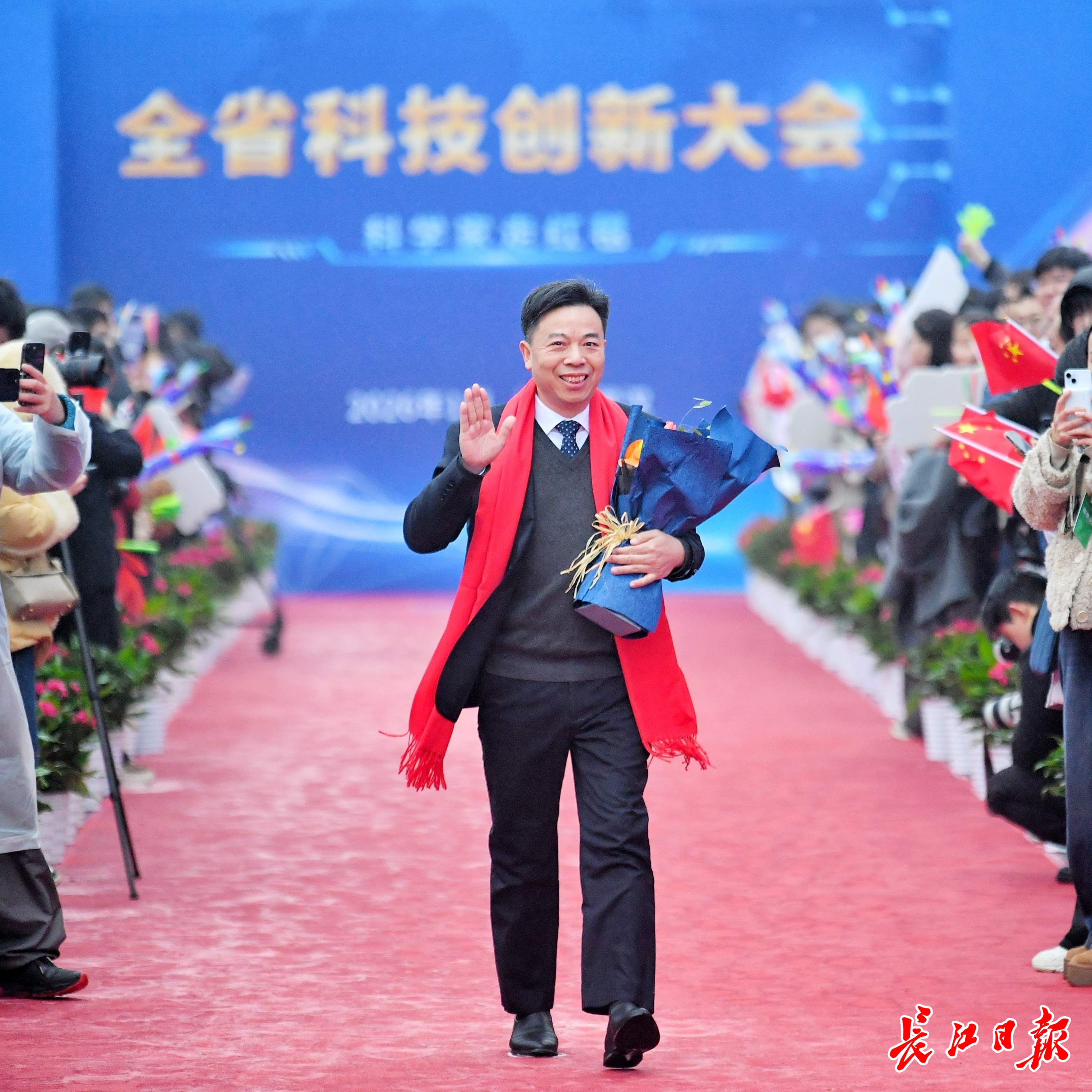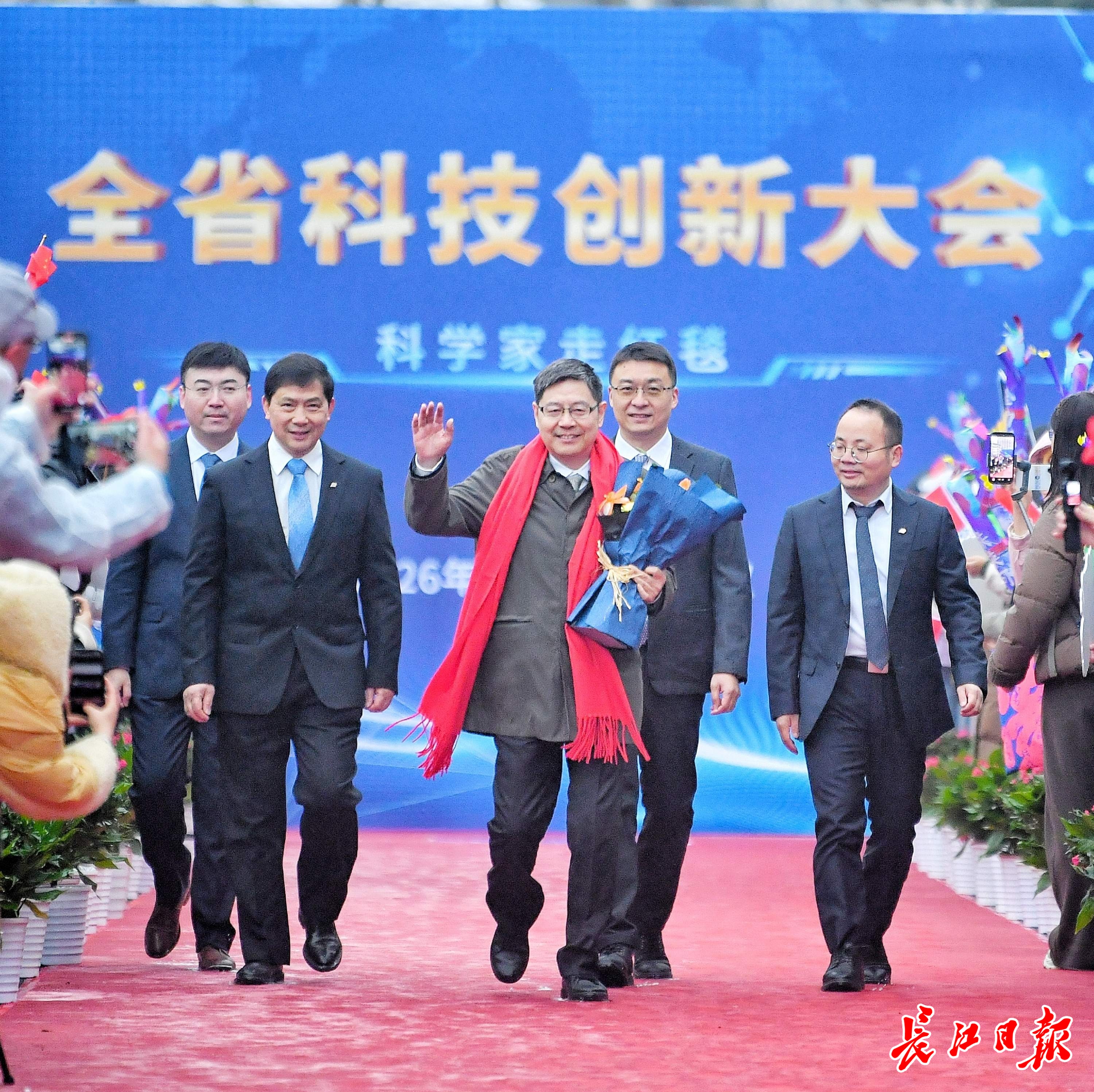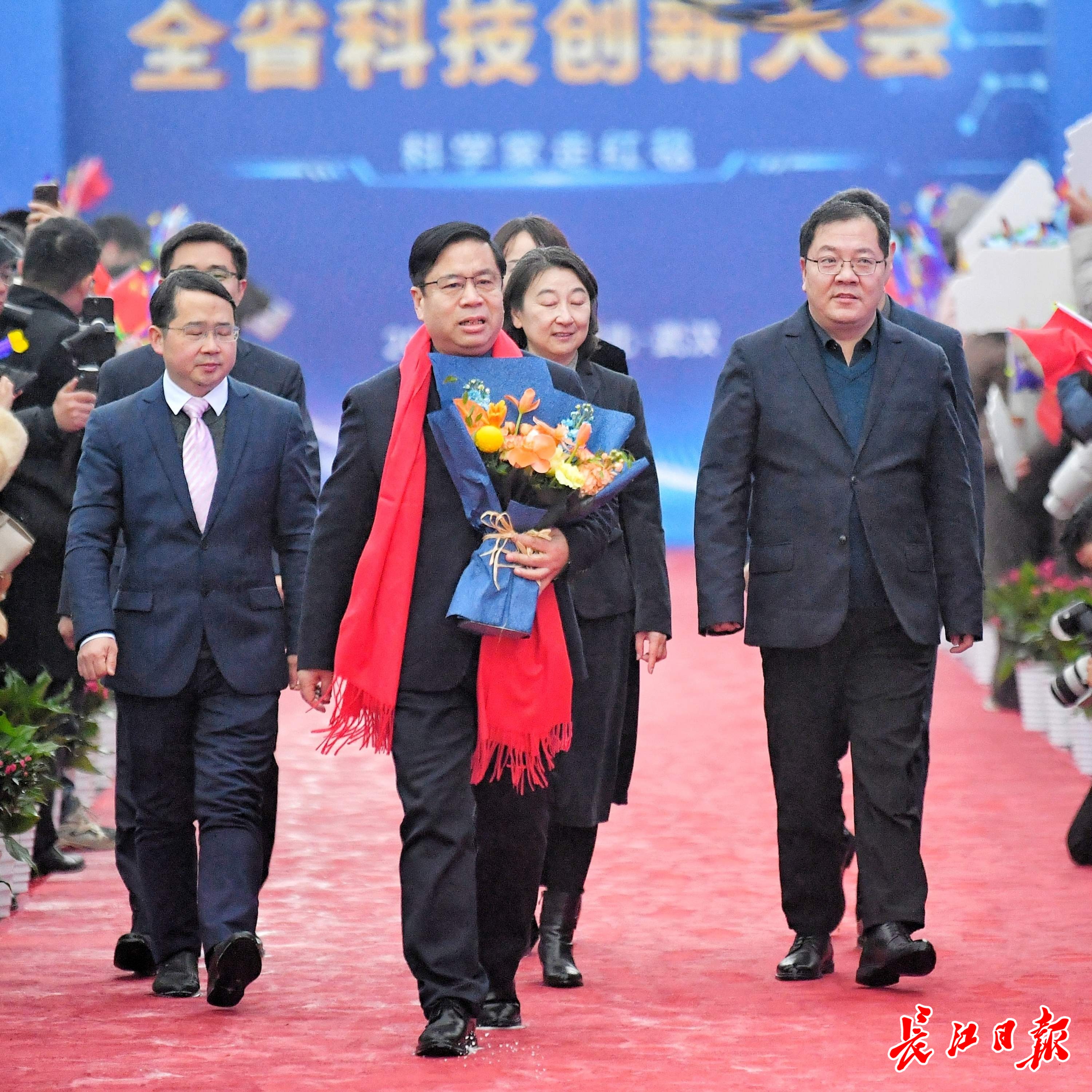 长江日报大武汉客户端1月4日讯1月4日,湖北省科技创新大会在武汉举行。举办大会的洪山礼堂外,一条百米红毯铺就星光大道,在鲜花簇拥中,12位“科学之星”款步而来。这已是湖北省科技厅“科学家走红毯活动”第七年绽放荆楚,见证着湖北科技创新的蓬勃脉动。