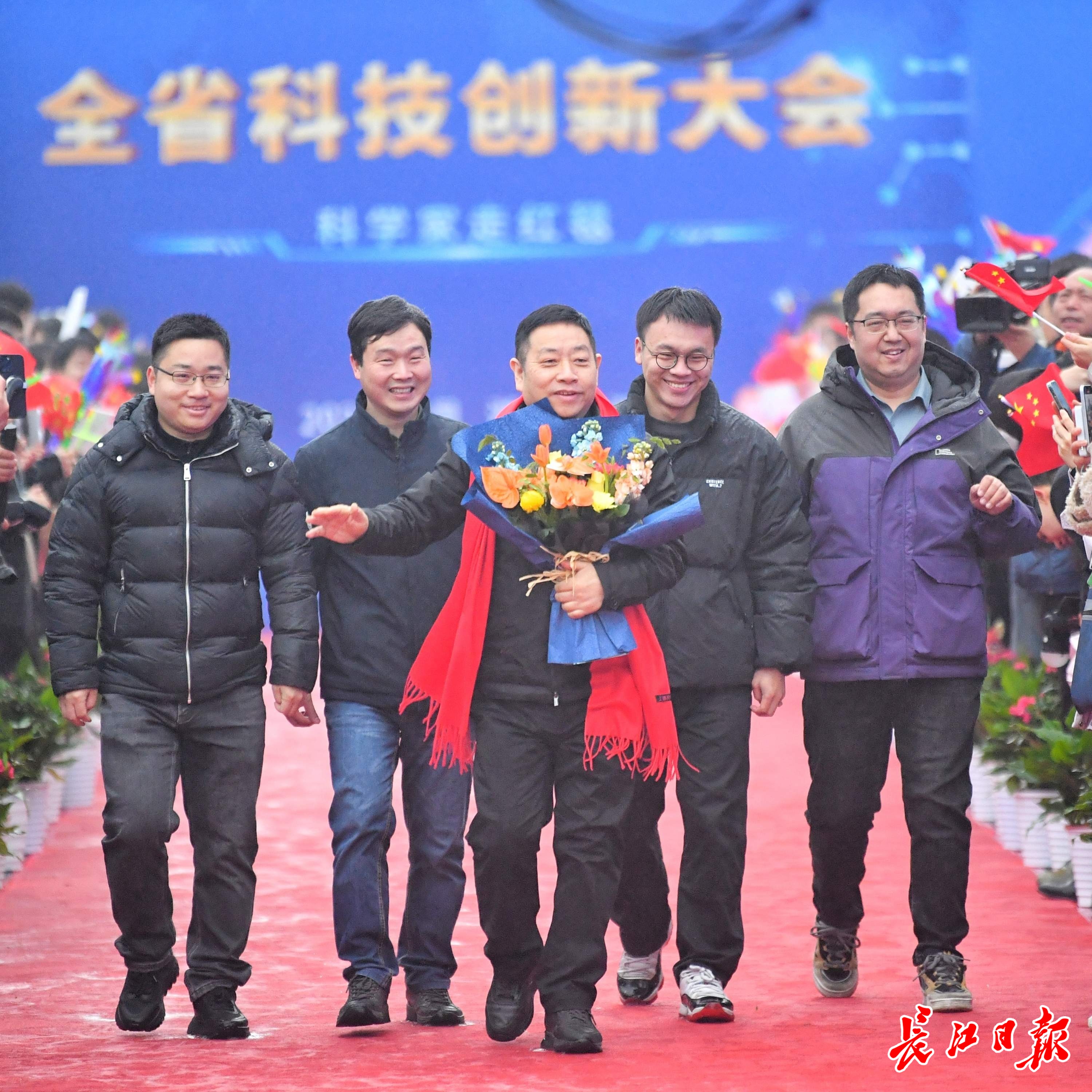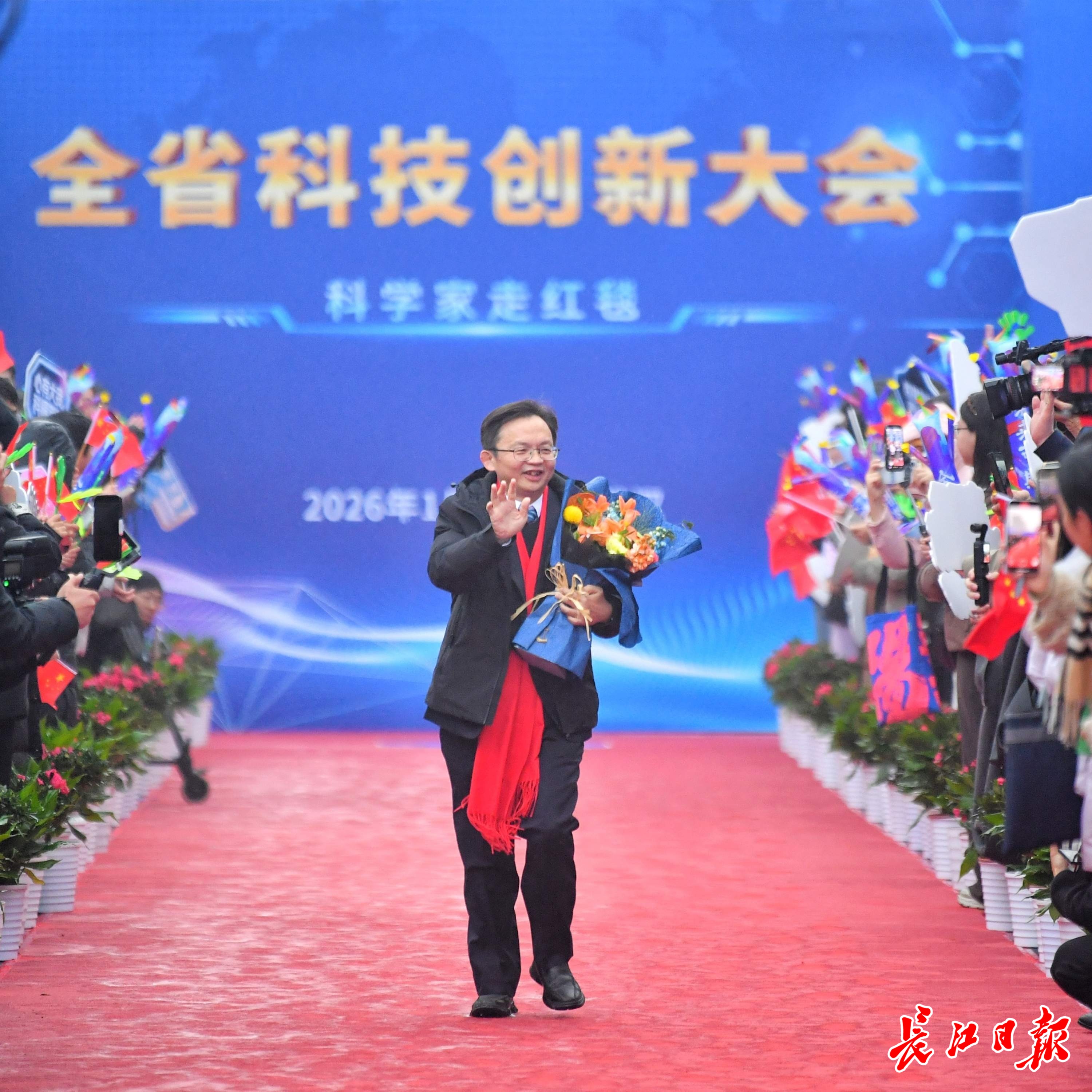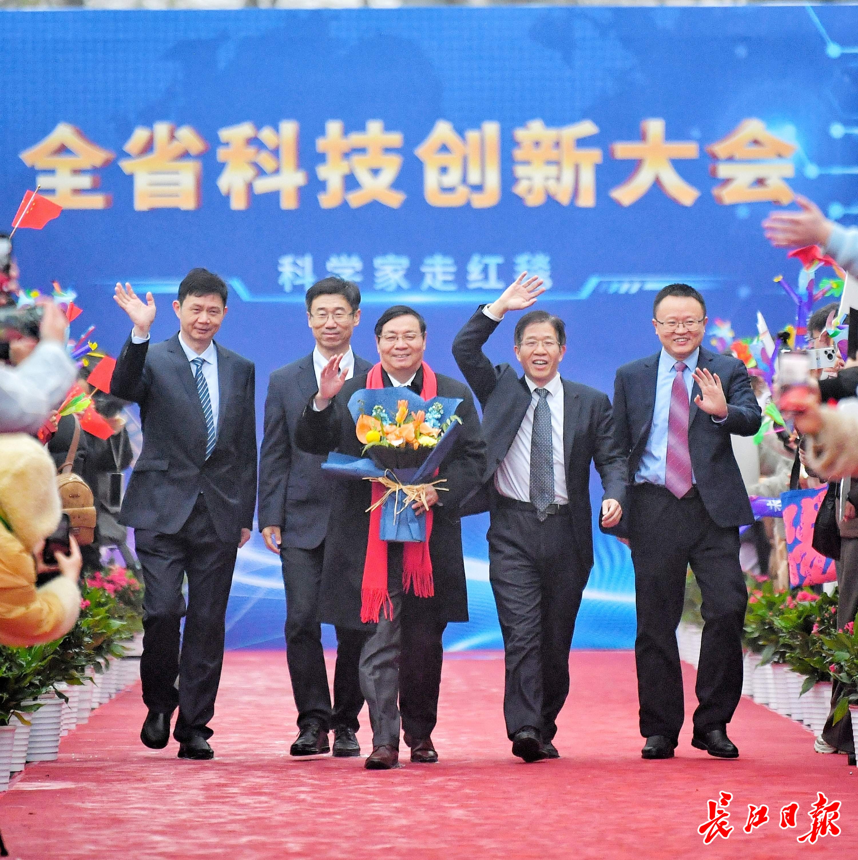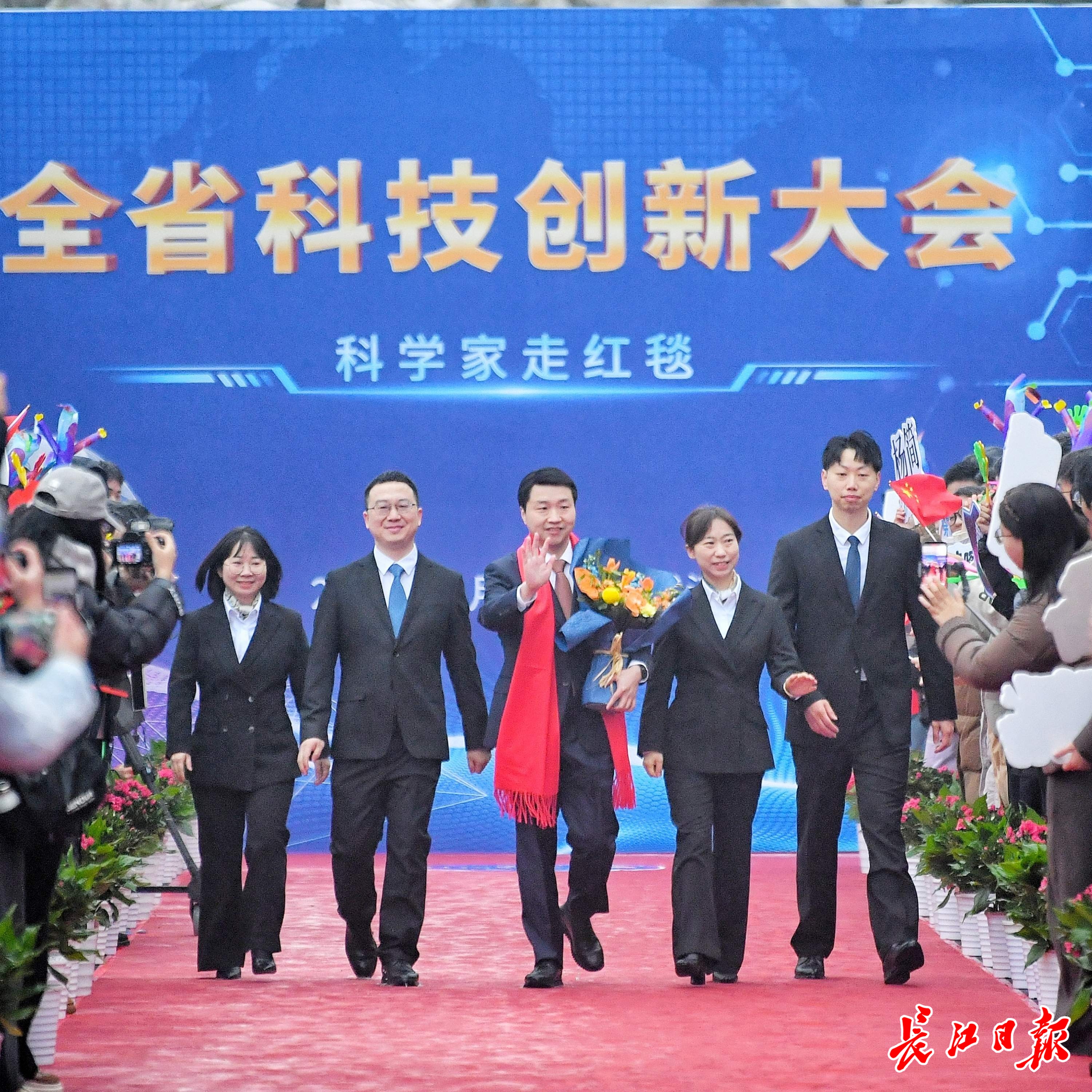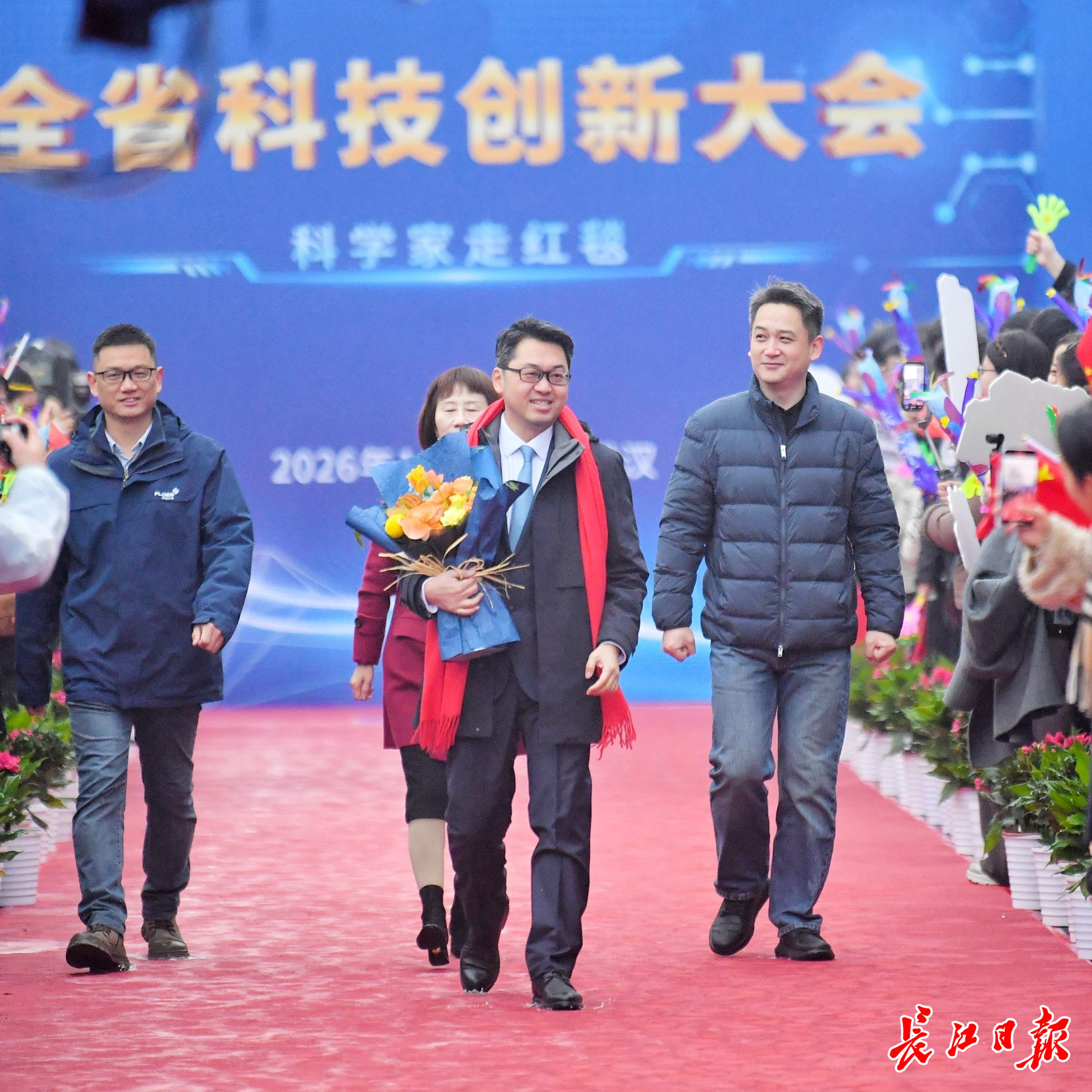 长江日报大武汉客户端1月4日讯1月4日,湖北省科技创新大会在武汉举行。举办大会的洪山礼堂外,一条百米红毯铺就星光大道,在鲜花簇拥中,12位“科学之星”款步而来。这已是湖北省科技厅“科学家走红毯活动”第七年绽放荆楚,见证着湖北科技创新的蓬勃脉动。