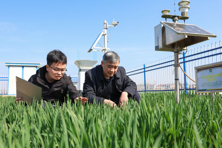 2025年3月19日,在湖北省南漳县清河管理区雷家巷优质小麦种植示范基地,农技人员利用智能农作物病虫疫情监测系统和气象观测设备,查看虫情和土壤墒情等情况。新华社发(杨东摄)