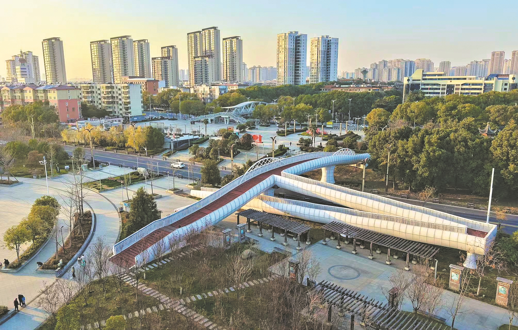 近年来,襄州区以群众需求为出发点,大力实施民生工程,在重点路段建设人行天桥,实现区域人车分流。图为近日拍摄的浩然广场和航空路之间的人行天桥。