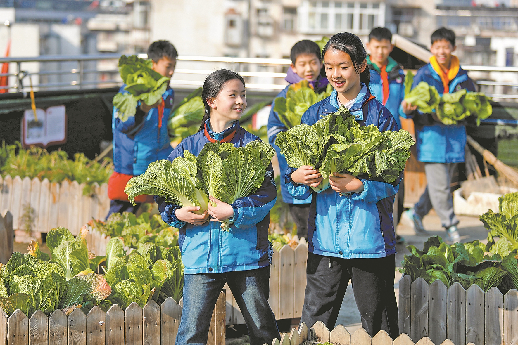 1月16日,在市晨光小学“空中农场”,学生们在老师的指导下采摘大白菜,收获劳动果实。大家在躬身实践中感悟农事乐趣与丰收喜悦,让劳动教育落地生根。