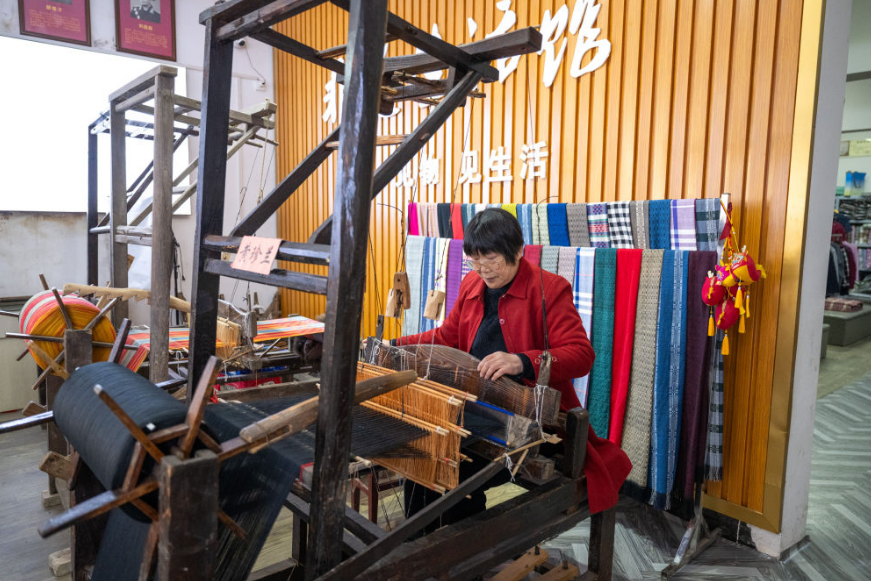 冬日午后,暖阳轻洒,大别山像披上了一层金纱。嘎吱、嘎吱……在黄麻起义策源地之一的湖北红安县七里坪镇长胜街,机杼声从街尾小院悠悠传出。循声而入,八架旧式木织机在屋内整齐排列,一老一少两位织女正全神贯注地忙碌着,提综、投梭……每个动作娴熟又精准。