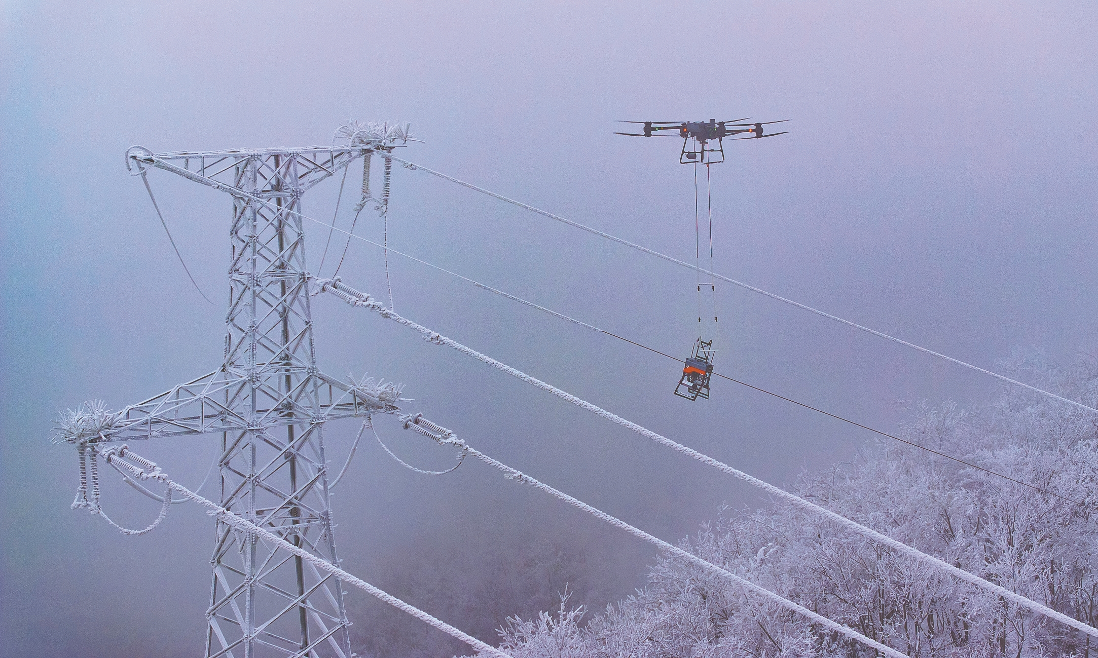 1月20日,在保康县后坪镇蜡烛山村,110千伏翁天一回42-43号塔导线上方,国网襄阳供电公司输电运检分公司工作人员操作无人机将完成工作的除冰机器人吊离作业区。