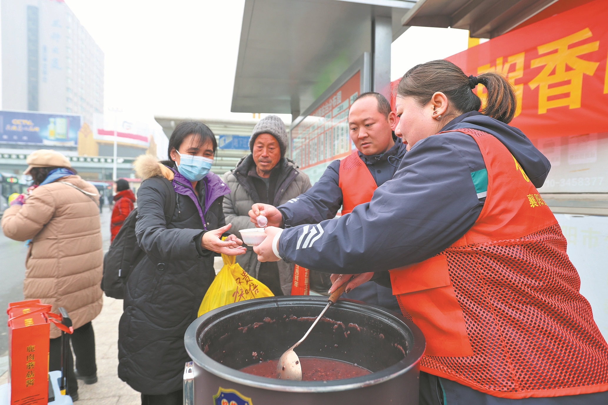 1月26日,在襄阳火车站公交枢纽站,襄阳公交志愿者给旅客送上腊八粥。当天是腊八节,一场“腊八粥香暖人心 侠义公交伴你行”活动在襄阳火车站公交枢纽站举行。襄阳公交志愿者将一碗碗热气腾腾的腊八粥送到旅客手中,让他们在旅途中感受到浓浓温情。