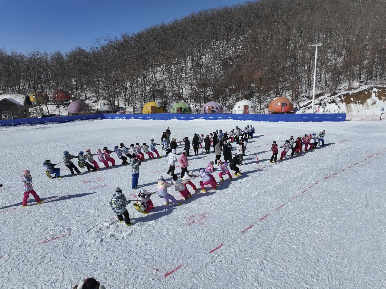 第十二届全国大众冰雪季“鄂台冰雪缘・荆楚共此时”两岸青年滑雪文化活动现场,来自台湾的青年们正在开展雪上拔河比赛。 张照 摄
