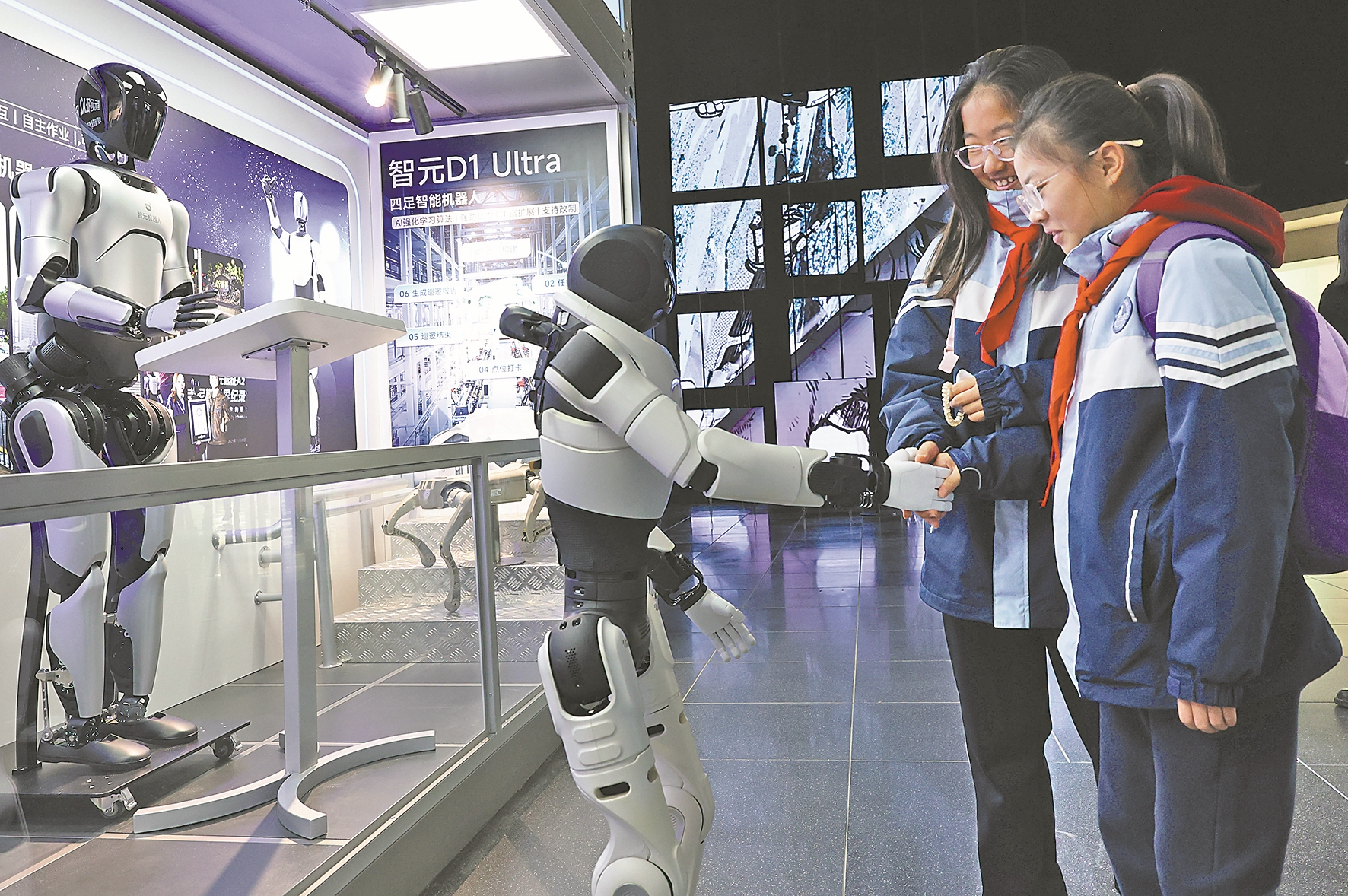 1月27日,参观者在上海科技馆“明日行者”展区内与机器人握手互动。
