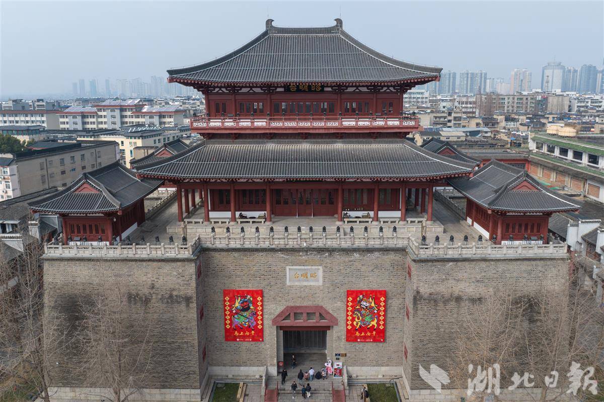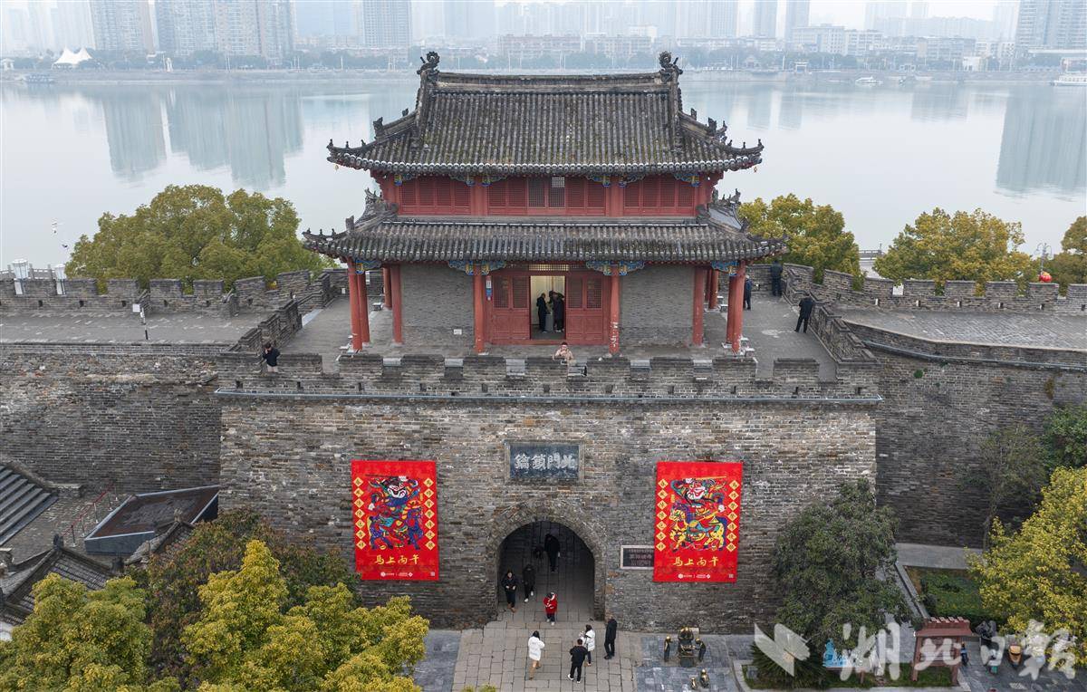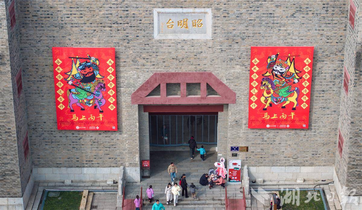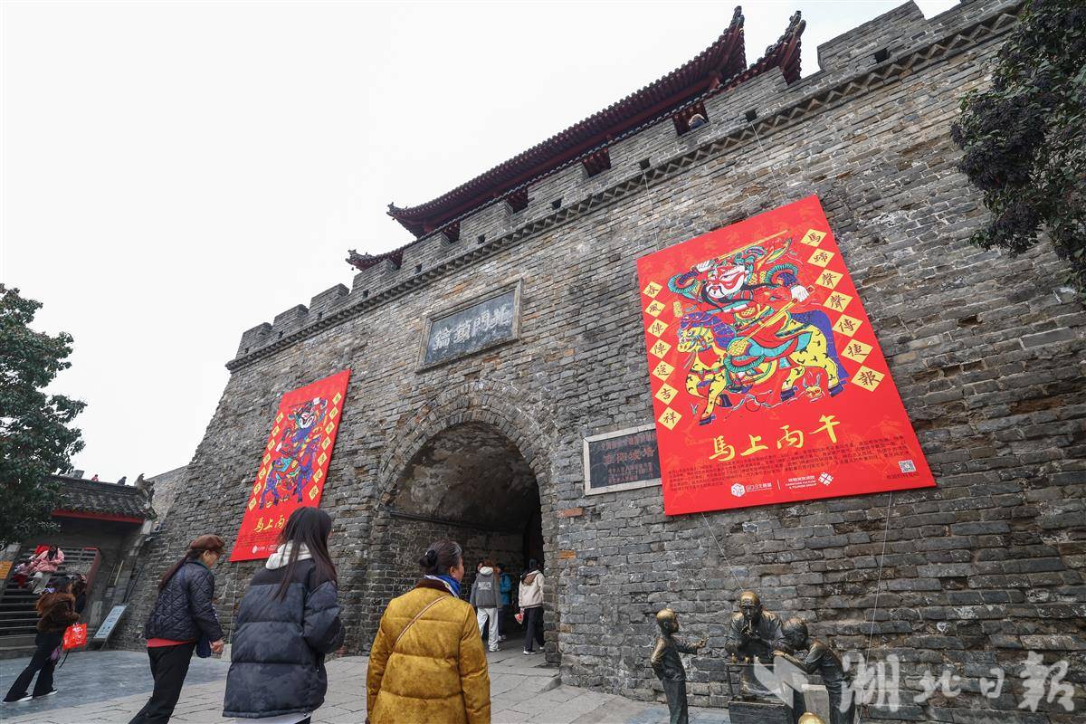 1月31日,襄阳古城临汉门、昭明台悬挂起了大型非遗年画,古城街头年味渐浓。据了解,临汉门上的年画来自襄阳本地的国家级非物质文化遗产老河口木版年画,画面形象是传统民俗里的门神。昭明台上的年画在老河口木版年画基础上进行创新性手绘创作,让传统门神形象在创新表达中焕发新生。色彩鲜艳、造型生动的年画吸引了不少游客驻足观赏、拍照“打卡”。(视界网 杨东 摄)