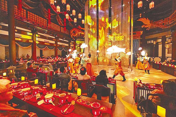 知音殿餐秀项目《三国群芳宴》试营业,在知音主题的演艺中融入荆楚美食,收获游客好评。 (湖北日报全媒记者 何宇欣 摄)