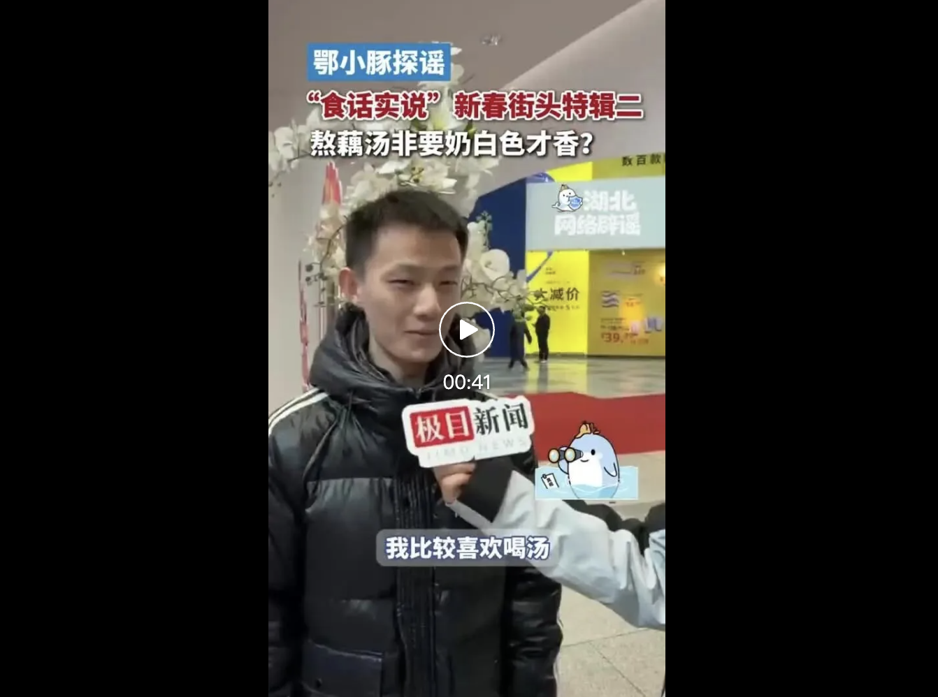 近日,湖北网络辟谣推出《鄂小豚探谣》栏目“‘食’话实说”新春街头特辑,走上街头采访市民看法,并结合权威科普拆解饮食误区,为大家送上安心年味指南。
