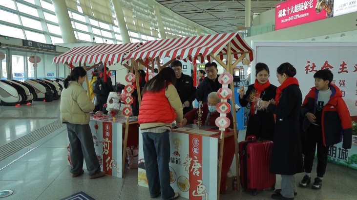 作为鄂西北重要的铁路枢纽,襄阳铁路系统在春运首日便展现出高效运转的图景。在高铁枢纽襄阳东站,尽管客流量较平常有了不小的攀升,但在车站工作人员和志愿者的引导下,整个车站显得井然有序。为营造节日浓厚氛围,川剧变脸、木版年画等“非遗”表演被引入候车大厅,为南来北往的旅客带来惊喜,游客侯先生拿出手机不停拍照,很快就集满了一个“九宫格”朋友圈:“在别的车站没有看到表演,这是第一次看‘变脸’,襄阳人民真的很热情。”