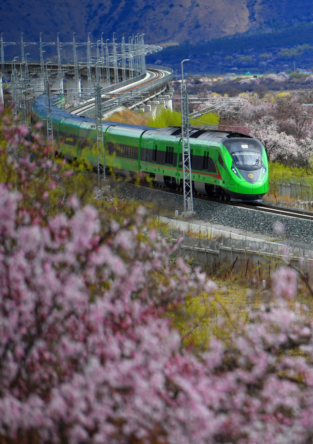 复兴号列车穿行在西藏拉林铁路林芝段的桃花间。新华社记者 觉果 摄