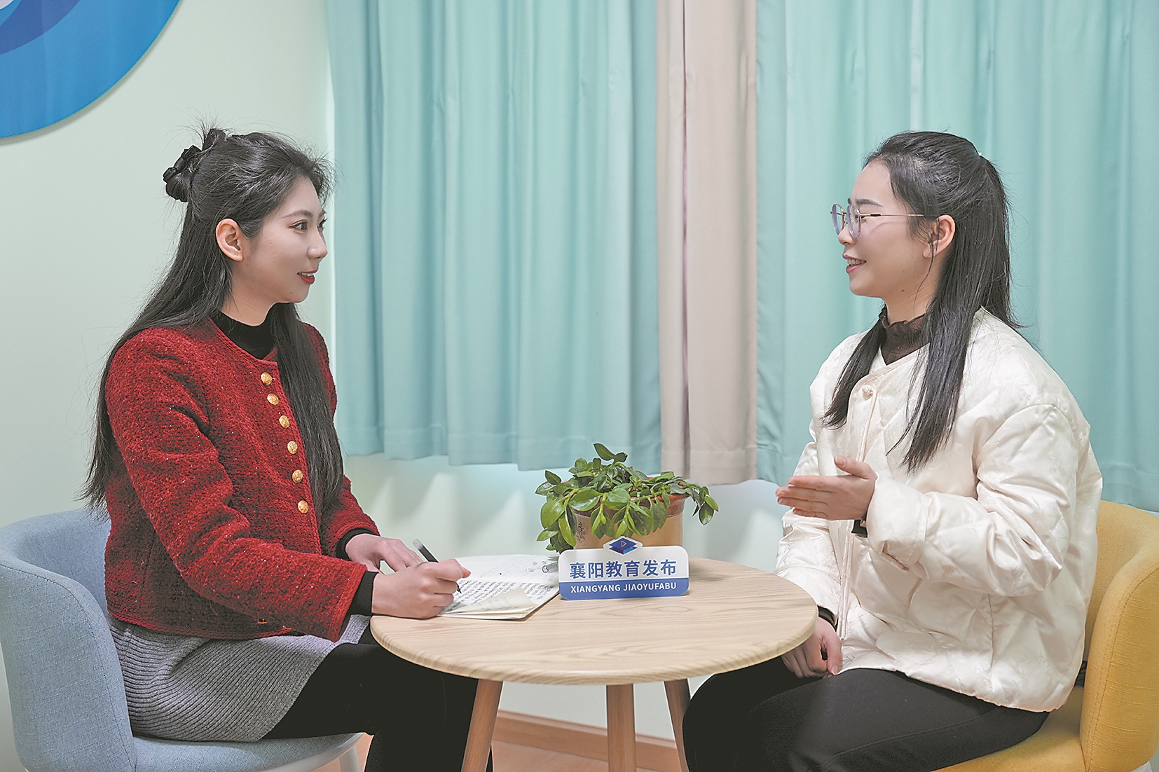 周俊梅(右)接受采访。