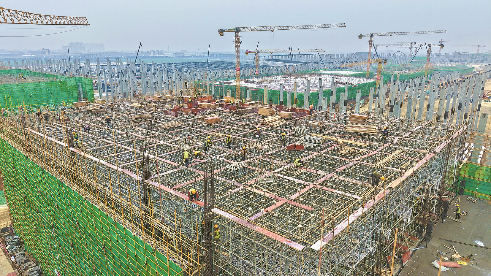 2月4日,在位于高新区的楚能新能源襄阳项目工地上,塔吊林立,工人们正忙碌施工。目前,该项目的基础施工已全面完成,部分主体结构封顶,预制柱和钢结构吊装施工全面铺开。