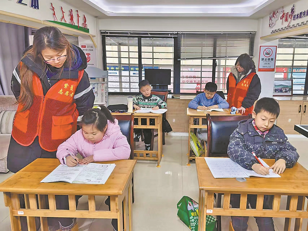 在春园社区举办的爱心托管班上,大学生志愿者辅导孩子们学习。 全媒体首席记者 李兴会 摄