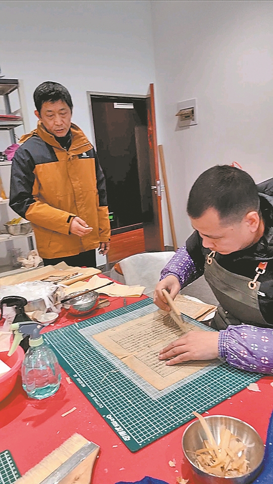市图书馆古籍部主任黄雪松,正在指导古籍修复师庞远振修复明刻版《资治通鉴》。 全媒体首席记者 朱科 摄
