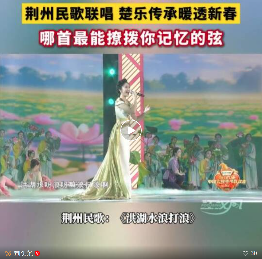 随后,《洪湖水浪打浪》的经典旋律响起,串联起广西刘三姐歌谣、荆州本土民歌的新春联唱,体现了红色精神与优秀传统文化的代代相传。