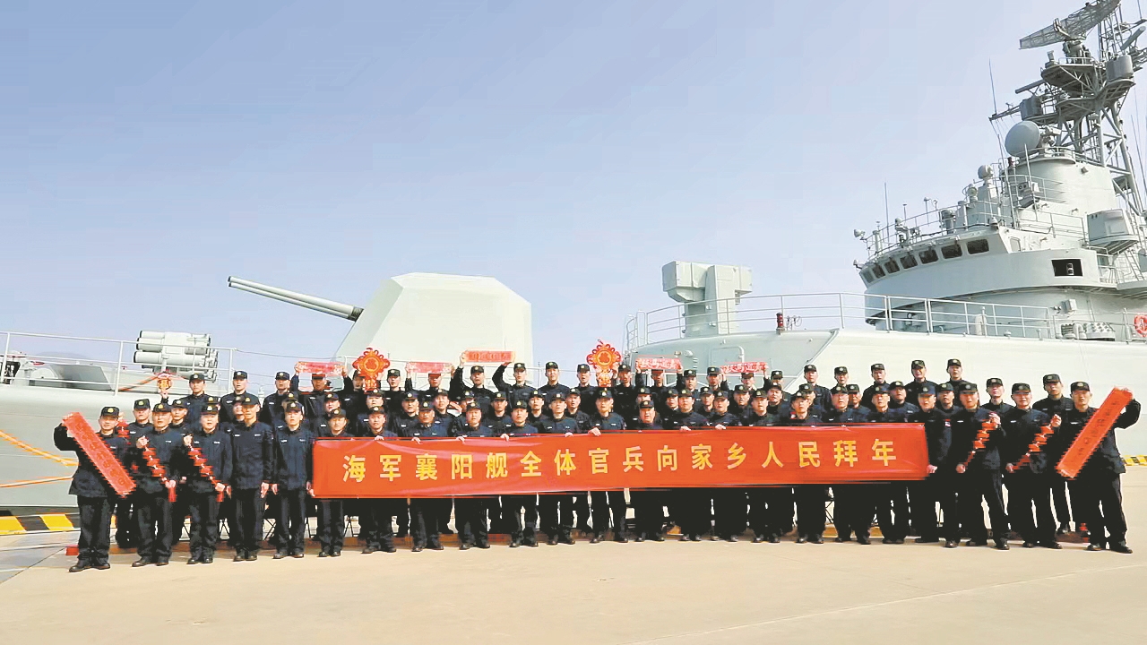 在襄阳舰甲板上,官兵们精神抖擞,军容严整。大家手持“福”字、中国结、红灯笼与新春对联,齐声向襄阳人民拜年,送上诚挚祝福:祝家乡人民新春快乐、马到成功、四季安康、万事顺利;祝愿家乡建设马不停蹄、一马当先、日新月异、蒸蒸日上。