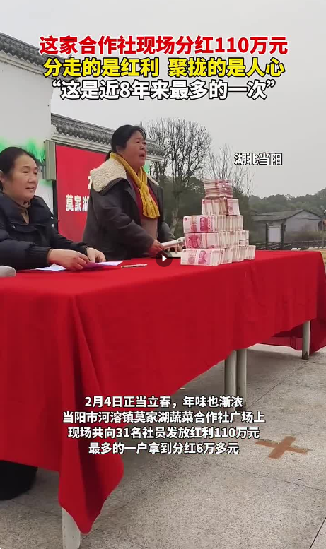 2月4日正当立春,年味也渐浓。当阳市河溶镇建国村的广场上,欢声笑语,暖意融融。“跟着合作社干,蔬菜销路不用愁。我是最早一批加入的,今年拿到3.4万元分红!”从莫家湖蔬菜合作社理事长高华荣手中接过2025年分红款后,曹金芳乐得合不拢嘴。