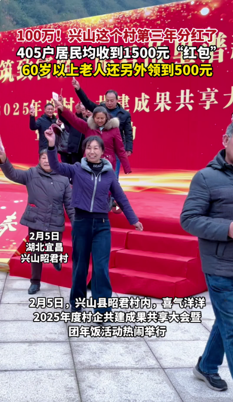 村民们欢聚一堂,喜提100万元“新年红包”。2025年,昭君村集体经济收入达294万元,较上年增长144万元。