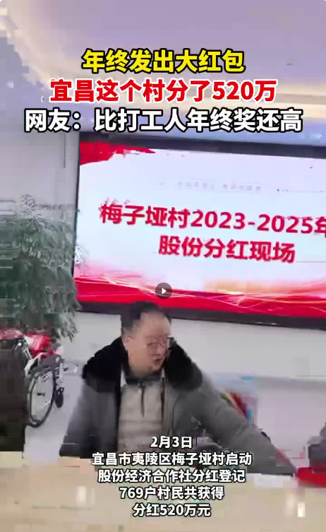 “12035元,老伴儿,村里的分红到账啦!”2月9日,夷陵区梅子垭村村民李广华收到银行发来的短信提醒,牵着孙儿,“走,办年货去!”大红包很丰厚,包括李广华在内的769户村民共获得分红520万元,这笔分红来源于梅子垭村自2023年来的村集体收益。