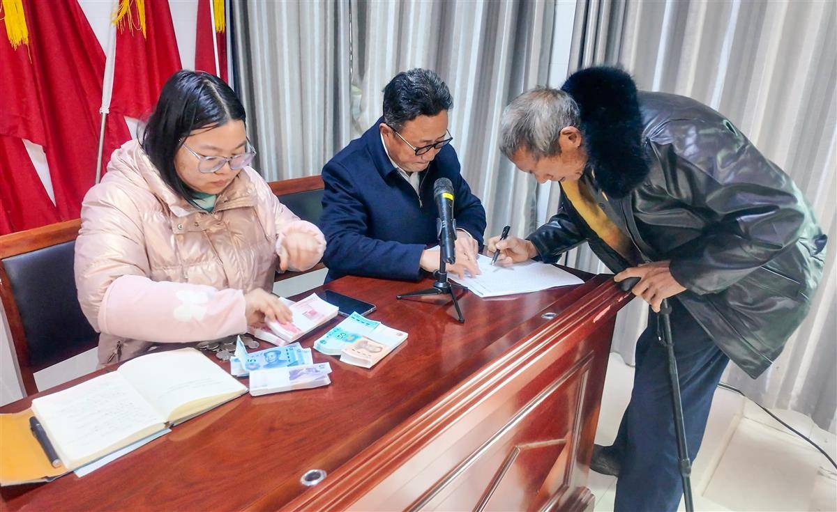 莫家湖合作社社员高兴地接过分红款。 (湖北日报全媒记者 李仁玺 摄)