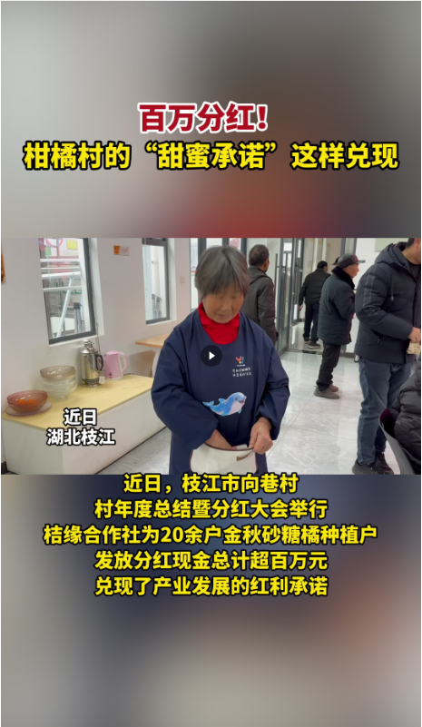 “过去品种老旧、销路不畅,如今品种改良,村里还建起电商平台,在家门口就能挣钱。”近日,枝江市仙女镇向巷村举行桔缘合作社金秋砂糖橘种植户技术交流暨年度总结大会,种植户共领到分红现金超百万元。