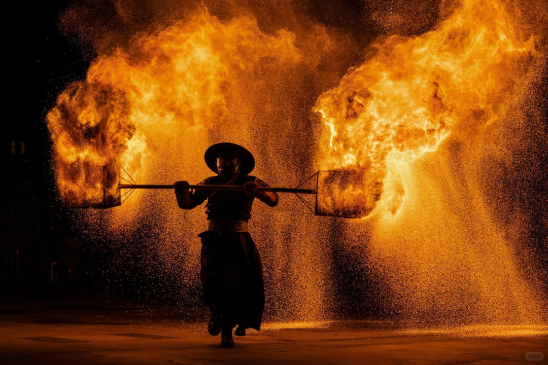 夜非遗火壶表演惊艳亮相,艺人手持特制壶形铁网,牵引抖动间,万千火星如金沙聚散、似星河垂落,勾勒出流动的火之画卷,传递“火除邪祟,万家安宁”的美好寓意;