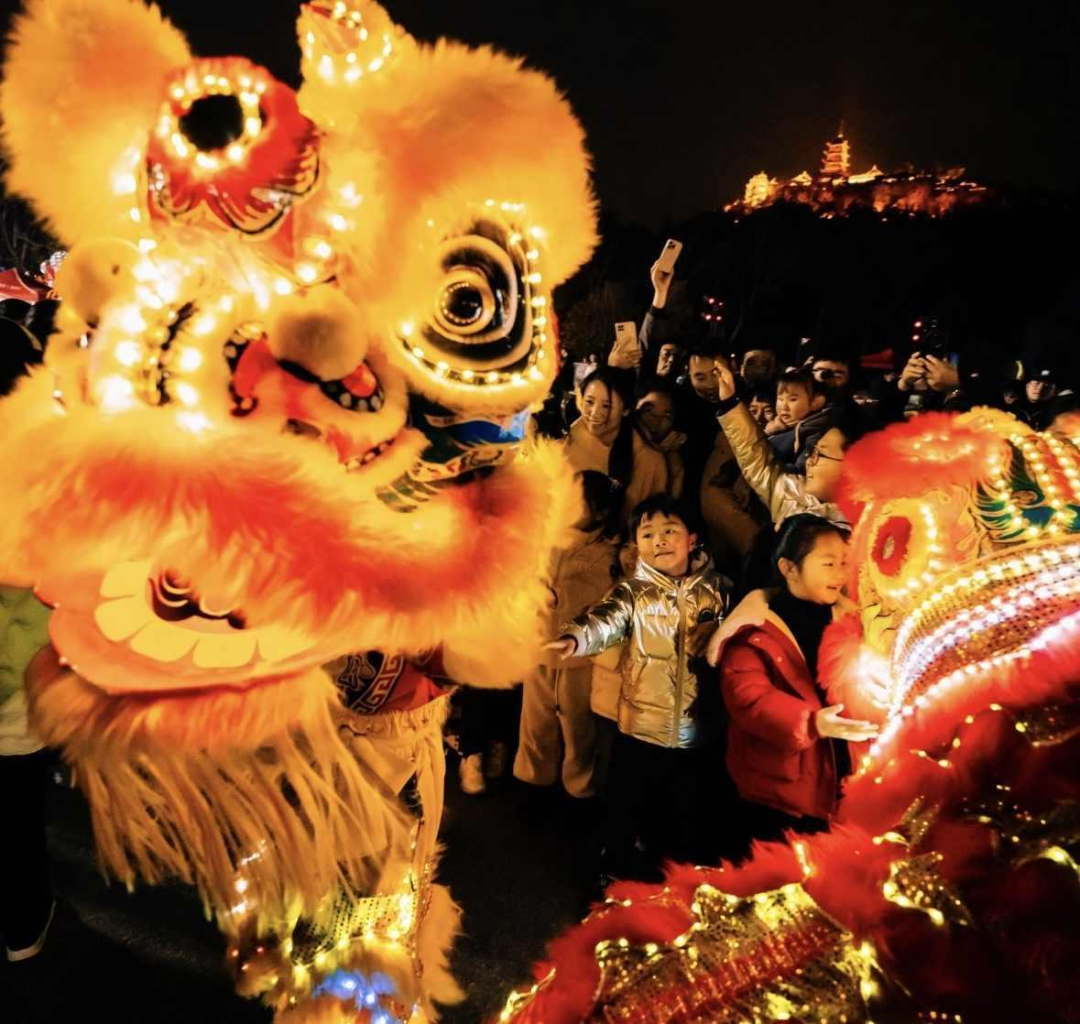 瑞狮欢悦表演率先登场,LED灯带点缀的醒狮随音乐节奏腾跃舞动,色彩随动作交替变换,与古城灯光交相辉映,尽显喜庆与灵动。