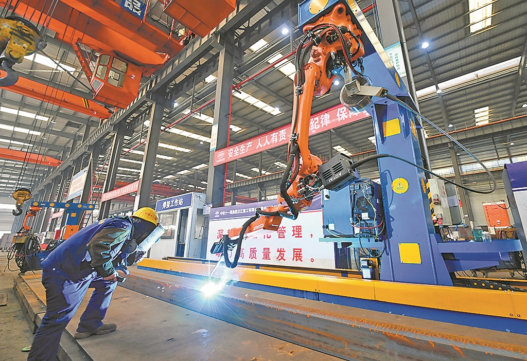 2月10日,中铁十一局集团汉江重工有限公司车间,机械臂正在焊接架桥机部件。