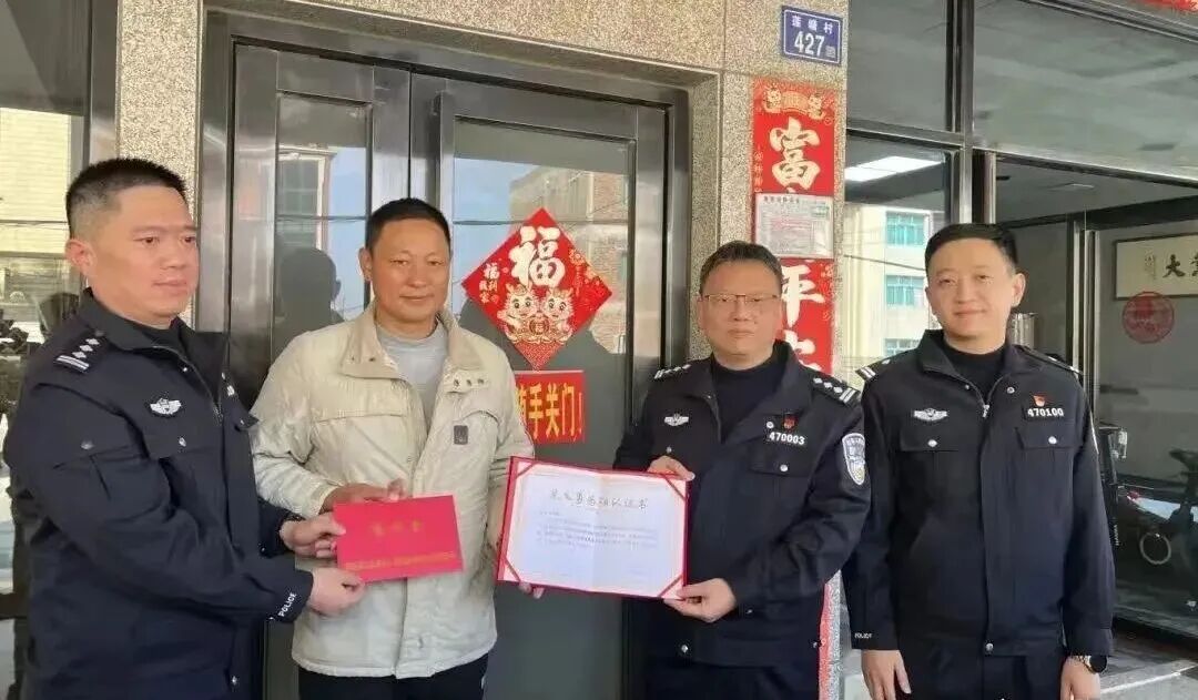 惠安县公安局与见义勇为协会上门为胡俊辉(左二)颁发证书及慰问金