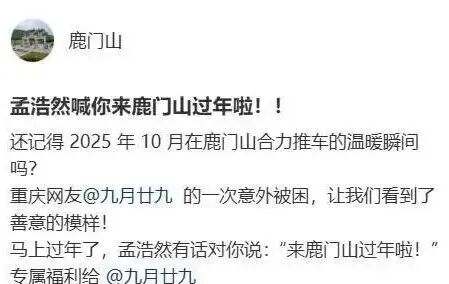 “鹿门景区喊你来过年。”2月6日,鹿门山景区公众号隔空喊话重庆网友@九月廿九,“品唐诗,知年俗,过大年。”
