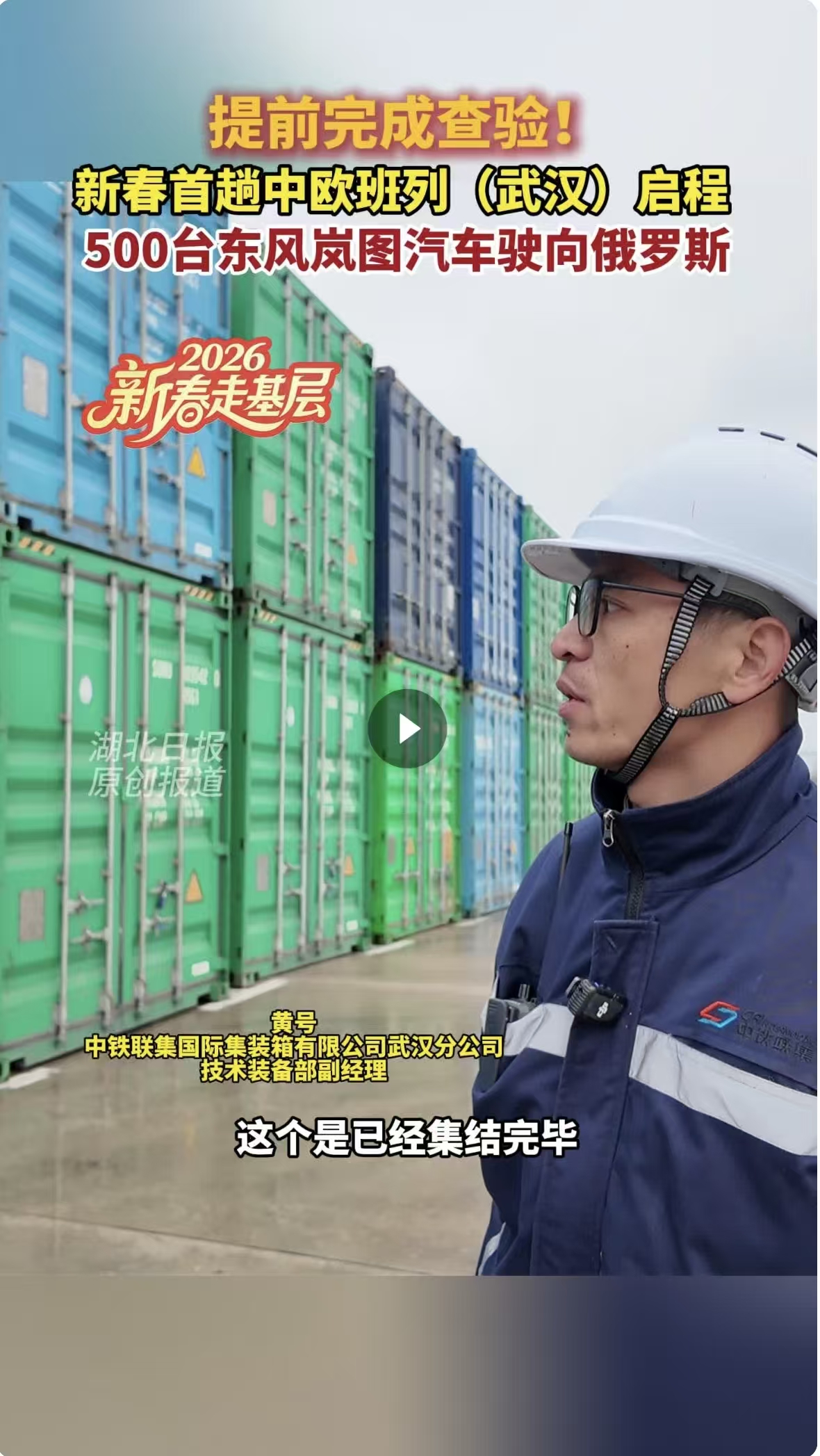 该趟中欧班列共承运55个大柜,110标箱,经阿拉山口口岸出境,预计16天左右抵达俄罗斯。湖北港口集团旗下汉欧国际有关负责人介绍,春节假期期间,中欧班列(武汉)将发运约500台东风岚图汽车,以定制化专列服务,助力“湖北造”新能源汽车抢抓海外市场机遇,为省内龙头企业国际化布局保驾护航。