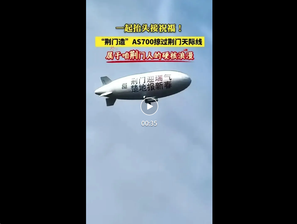 2月17日,农历大年初一,由湖北长江航特低空飞行器科技有限公司(以下简称“长江航特”)全国独家运营的AS700载人飞艇在荆门城区成功完成马年新春首飞。这只圆润可爱的“空中白鲸”载着深厚的荆楚文脉与人间烟火,在云端开启了一场别开生面的新年巡游。