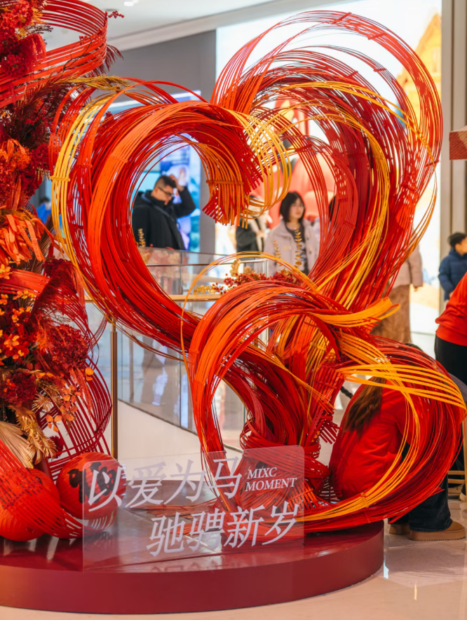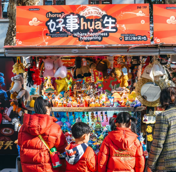 在武汉新天地、武汉万象城、新荣天街等商圈,各式各样的马年装置萌趣登场,红灯笼、福字贴处处可见;