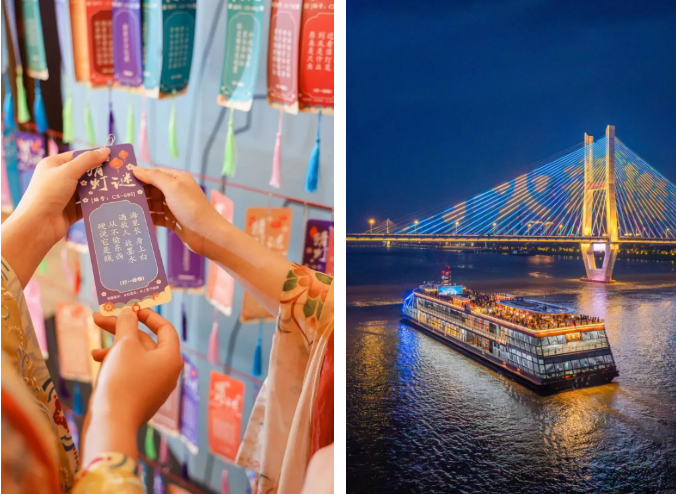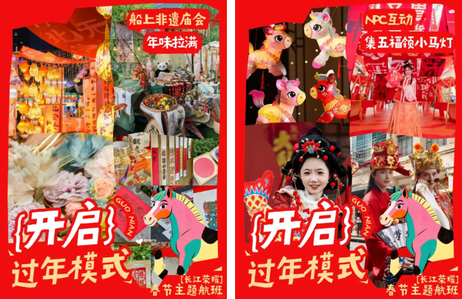 长江荣耀游船邀请非遗传承人驻场,现场展示剪纸、糖画、汉绣等传统手艺,再配上新春限定茶点、民乐演奏、NPC互动,打造“赏江景、品年味、玩非遗”的沉浸式游船体验;