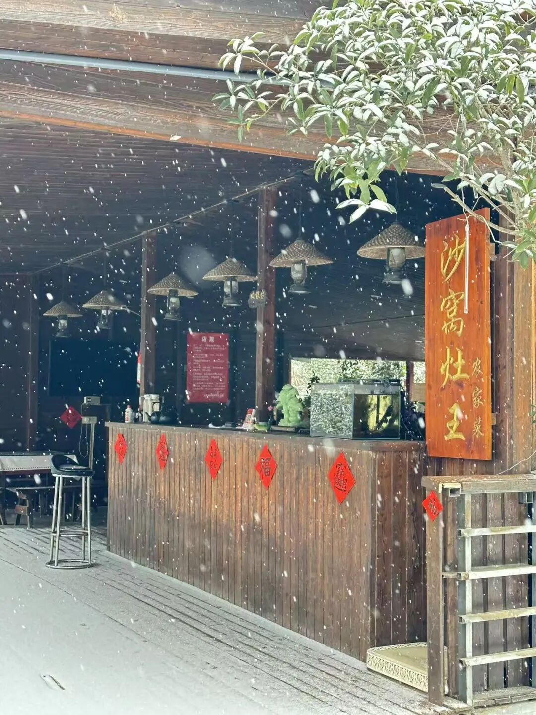 正月初四,洋澜湖畔,泊野·小院望的主理人小恩正忙着直播互动,小院内,顾客们或是围炉煮茶,或是拍照打卡。挂红灯笼、贴上春联,今年春节,她的小院从日常的静谧悠闲,转变为充满传统年味的烟火场景。